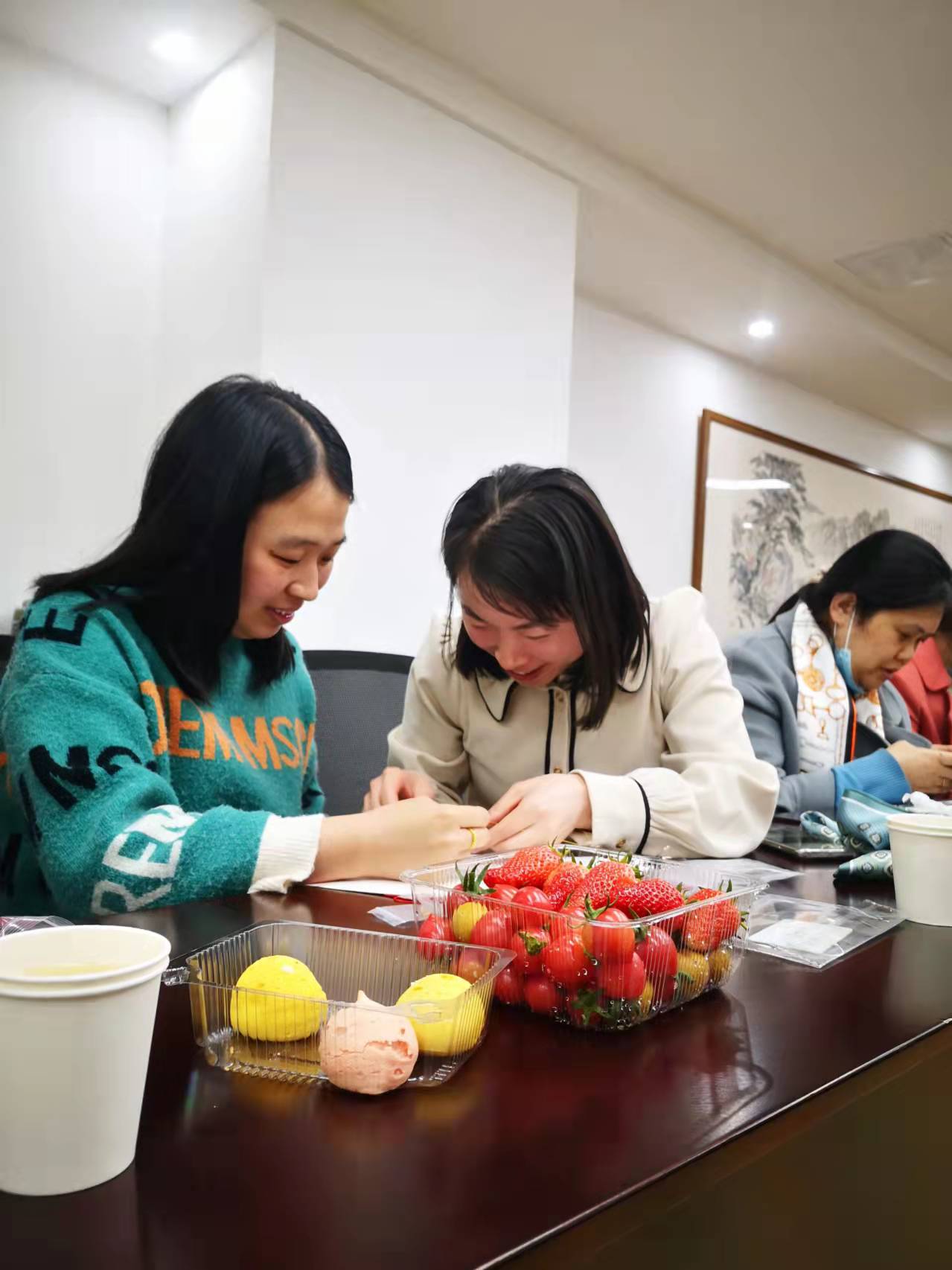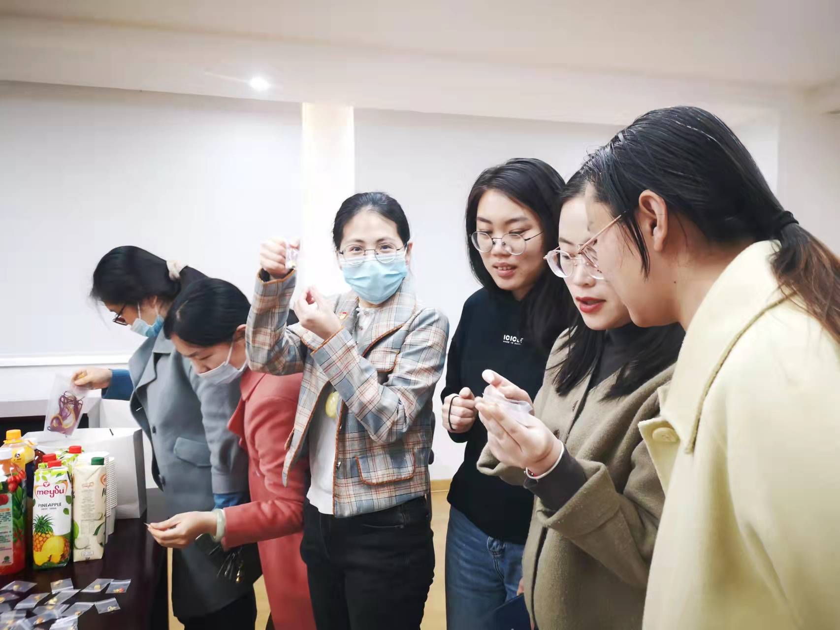 为每位“女神”准备了绳编工具包、水果、点心、鲜花等,观看了绳编的完整视频,在怡然恬静的氛围中体验绳编的乐趣和意境,感受传统绳编文化的魅力和博大精深。大家认真学习,互相探讨交流,用自己灵巧的双手缠、绕、卷、勾,最终制作出精美的手绳。
