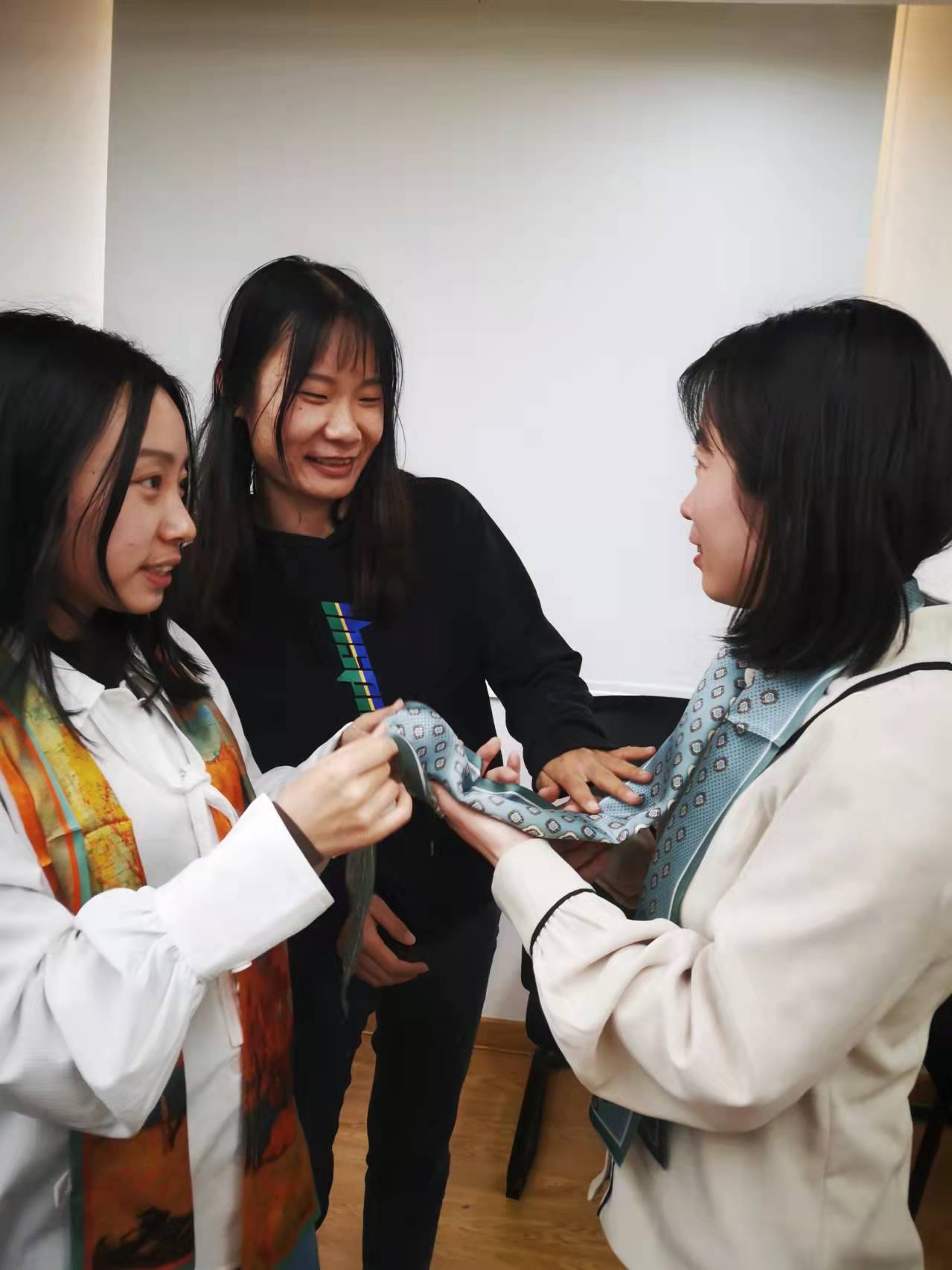 大家快乐地打开“丝巾”盲盒后,一起学习了多种系丝巾方法。大家享受着搭配色彩、设计造型、相互系丝巾带来的乐趣和美好体验,展示着各自的才艺。